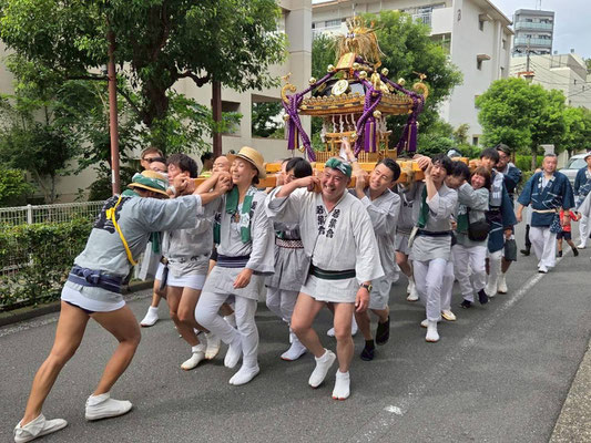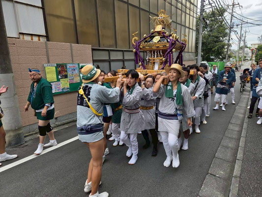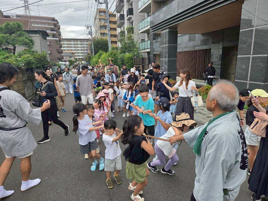 9日の宵宮では、こども神輿、太鼓の巡行。夕方から町会神輿の駅前連合渡御に参加。