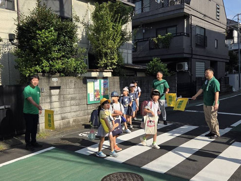 町会員ボランティアの皆様が登校時の見守り、横断歩道での旗振り、子どもたちへの声掛けを行っています。